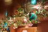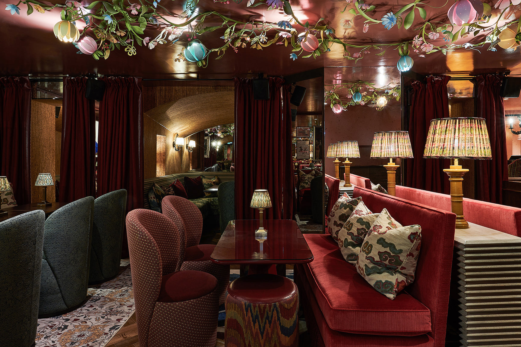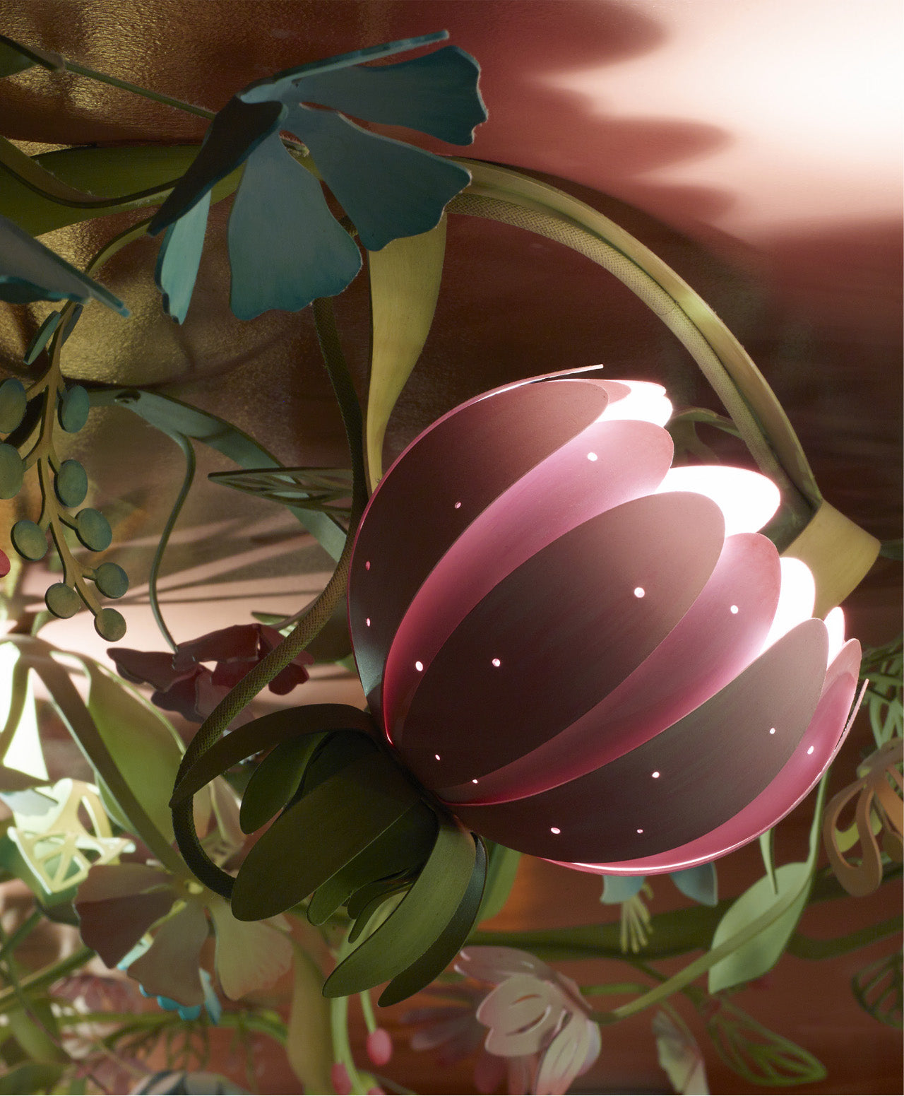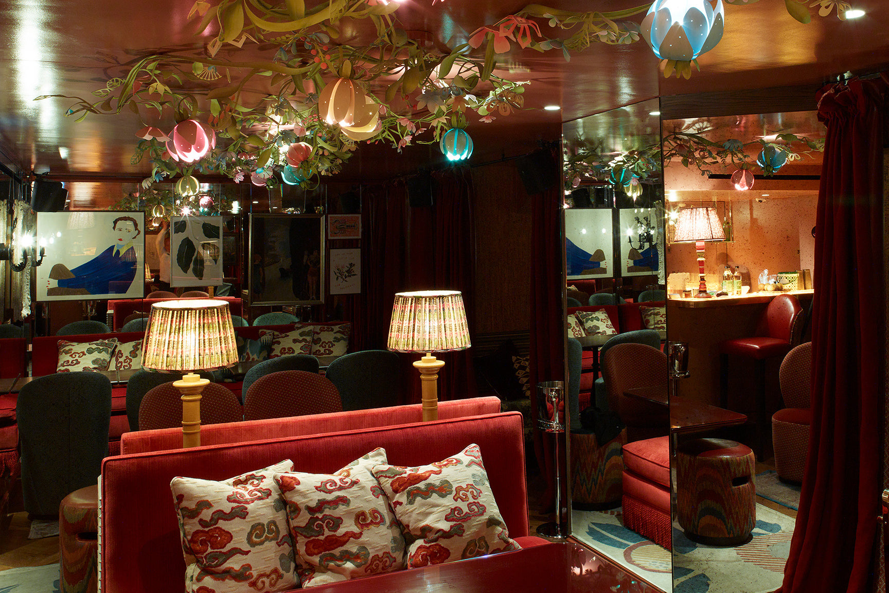 Constructed from laser-cut steel and decorated by hand in our painting studio, the bespoke chandelier winds across the downstairs restaurant ceiling as the blooms softly illuminate the space. The leaves and flowers are carefully hand-painted in a range of vibrant colours, selected by Tord to perfectly complement Rosanna’s interiors.