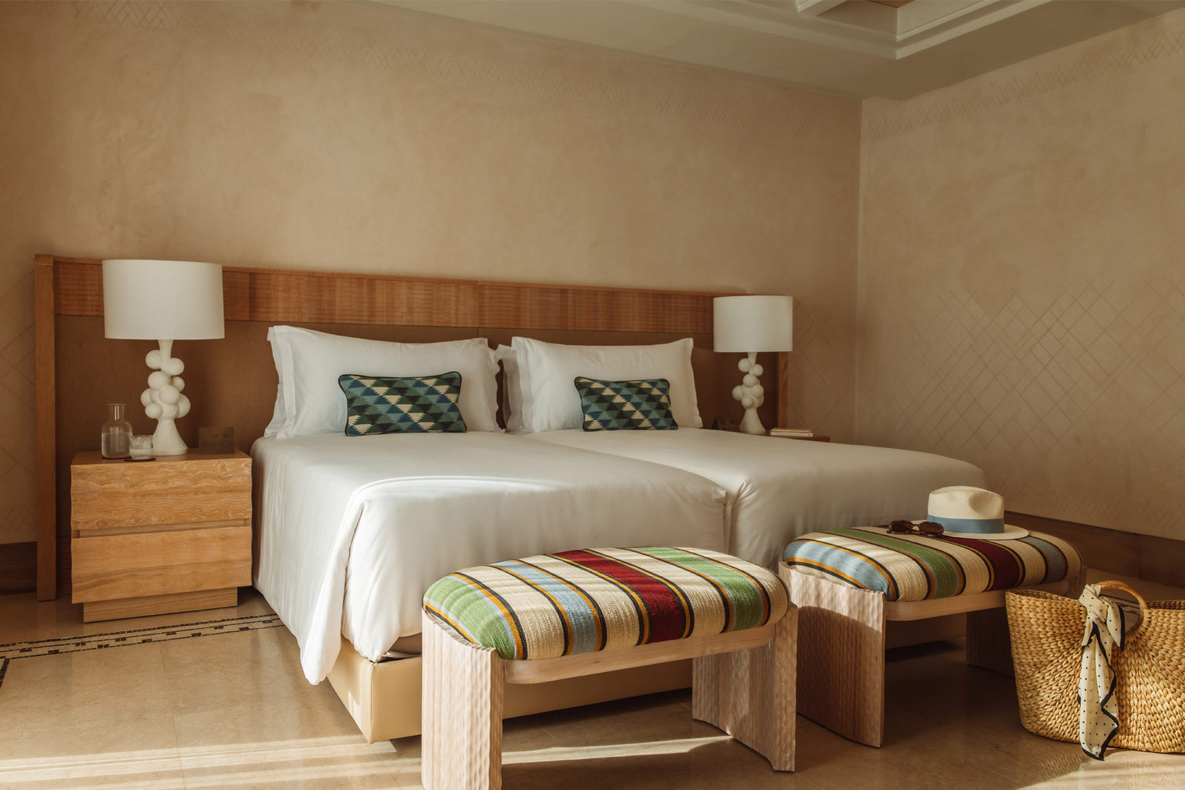 Royal Mansour Tamuda Bay comprises 55 suites and private villas, four restaurants, a world-class spa, and meticulously designed public spaces, all enriched with marble mosaics, zellige tiles, and works by emerging artists and artisans. To complement the richly layered environment, Porta Romana collaborated with Muza Lab and purchaser Primarious to supply a curated selection of signature and custom-made pieces.